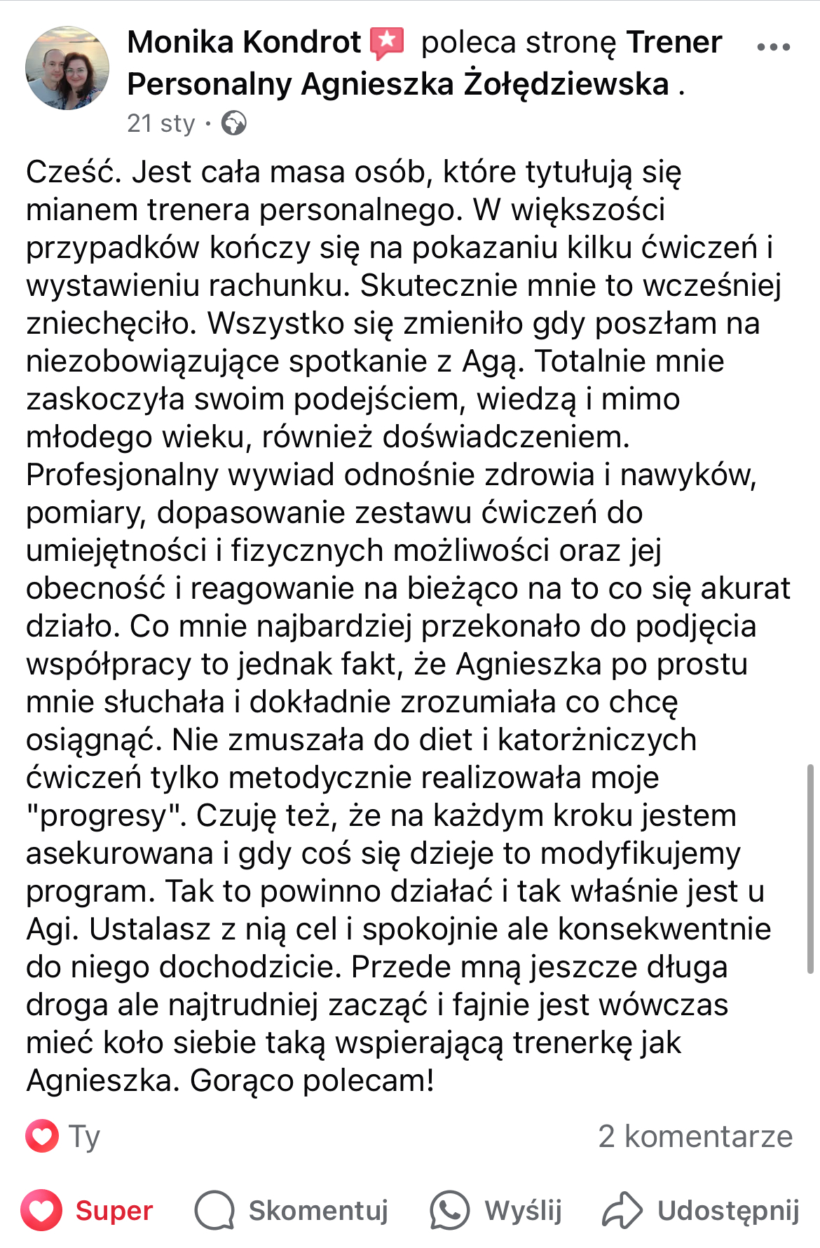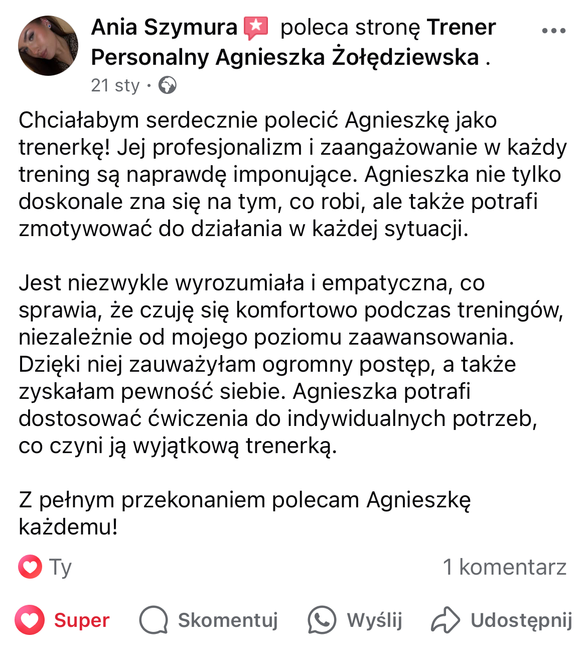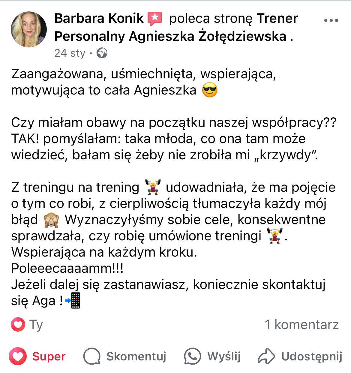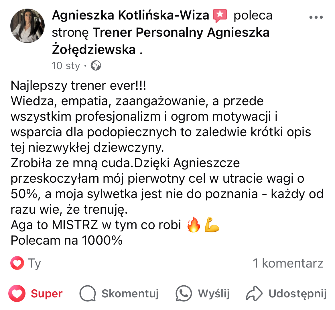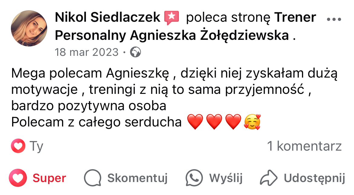 W mojej pracy dążę do tego, by zaszczepić w moich podopiecznych prawdziwą miłość do ruchu. Największą satysfakcję daje mi obserwowanie, jak z czasem zmienia się ich spojrzenie na siebie i na życie — gdy zaczynają koncentrować się na procesie, a nie tylko na celu i sięgają po to, co wcześniej wydawało się poza ich zasięgiem. Chcę pokazać, że aktywność fizyczna to nie tylko droga do wymarzonej sylwetki i lepszej formy, ale przede wszystkim sposób na budowanie wewnętrznej siły, pewności siebie i radości z codzienności.